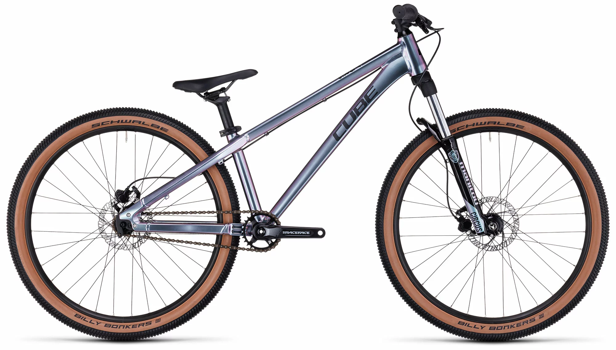 Beim CUBE Flying Circus trifft eine top ausbalancierte Geometrie für diverse Manöver in luftigen Höhen auf maximale Stabilität und Robustheit. Und damit das Handling zu deinem individuellen Fahrstil passt, gibt es das Bike in zwei verschiedenen Größen, die sich im Bezug auf die Oberrohrlänge unterscheiden. Die Ausfallenden lassen sich einstellen. Außerdem hat CUBE, um Gewicht zu sparen, einen integrierten Steuersatz verbaut. Den extrem kurzen Kettenstreben sei Dank wird selbst der Manual zum Kinderspiel. Und mit der Manitou Circus Federgabel, der RaceFace Aeffect Kurbel, der hydraulischen Scheibenbremsanlage und dem Singlespeed-Antrieb ist alles da, was du zum Ausbauen deiner Jump-Skills brauchst!