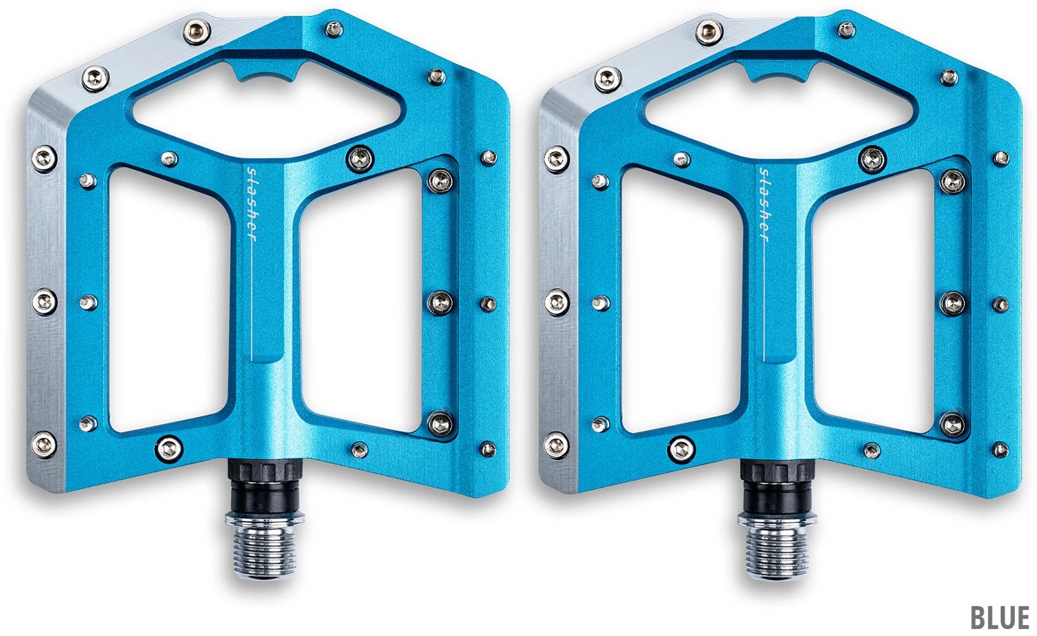 Slasher Pedale von CUBE – Der Blickfang an jedem Bike. Mit dem integriertem Flaschenöffner ist das neu designte und leichte Flat Pedal fraglos das Highlight auf und nach jeder Tour. Das Slasher hat aber noch weit mehr zu bieten. Das ultraflache Profil sorgt für weniger Gewicht und durch angefaste Kanten für mehr Bodenfreiheit in den Kurven. Der dreifach gelagerte Aluminiumkörper des Flat Pedals überzeugt mit einer aufwendigen two- tone CNC Bearbeitung und 10 austauschbaren Pins pro Seite.