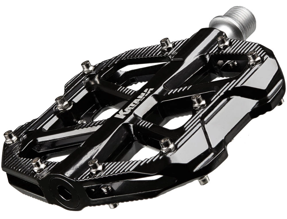 Die flachen Katana Blade Pedale bestehen aus einem robusten Magnesium-Korpus und sind mit jeweils zehn Evo-Pins für den nötigen Grip auf allen Trails versehen. Der Magnesium-Pedalkörper und die CNC-gefrästen Achsen sorgen in Verbindung mit hochwertigen Kugellagern für eine hohe Lebensdauer in jedem Einsatzbereich, selbst unter härtesten Bedingungen. Blade steht für flach, robust und schnell!