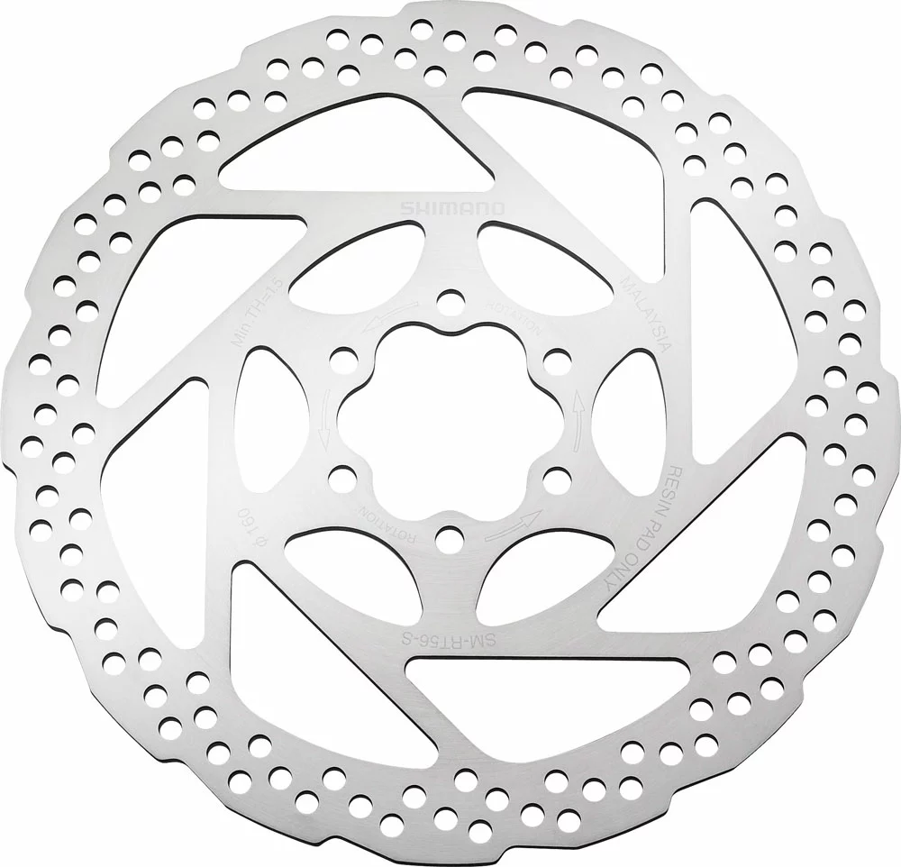Die Shimano SM-RT56 6-Loch Bremsscheiben bieten exzellente Bremskraft bei allen Fahrbedingungen. Dank der neuen Konstruktion mit Befestigungsplättchen lassen sich die Bremsscheiben sicher und schnell einbauen. Nur für Resinbeläge geeignet.